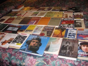 Jack and I ambled, discovering a shelf at the back with “gently used” half-price books the owners had read and brought in. We scored a couple there and Jack found yet another Bob Dylan book he didn’t own–which, given the morning’s timing debacle, seemed a small price to pay. The bathroom in Puddnhead cemented my belief that this was a charming place: authors who had signed books there left latrinalia on its walls. (That’s graffiti to you and me, but some of my friends are folklorists.)