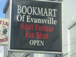 We left Bill, charmed and cheered, and drove to Evansville, Indiana, which boasted five bookstores, two of them new. We had some trouble locating Fulton Avenue Books, and when we pulled in, a man getting out of  a large pick-up gave us a funny–okay, unfriendly–look, as we folded up our travel atlas and hunted the camera before vacating our little hybrid.