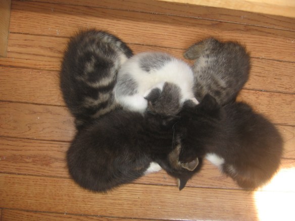 • I don’t know that I recommend ten at once; it just kinda happened. The good news is that Ma is adopted once the kitties have been homed. It’s easier (as you know) to home a baby than their mom or dad. So we’re feeling pretty good about that. And the kitties are the funniest thing going – never seen such shenanigans. Now I know how the ideas in the musical “Cats” were born.