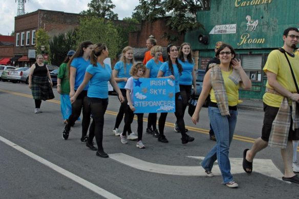 It’s very sweet. Here’s a pic of Wes and Rachael marching in the Big Stone Celtic parade Saturday past. They’re the ones in yellow tees, just walking out of frame.
