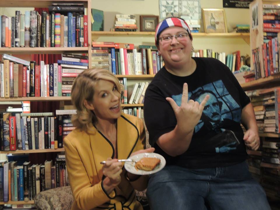 Down from the kitchen came Kelley, our master chef at Second Story Cafe, with fresh-made pumpkin bars. Those got passed around amid enthusiastic delight at their flavor and abundance. Max the foster cat wandered in, and next thing I know he and Jenna were cuddled in the armchair, carrying on like old friends. I think she fed him a pumpkin bar. People were swapping stories and having fun: just another night in the bookstore, with a movie star, two band members, a batch of fresh baked goods, a bunch of tripods, and a foster cat, all held together by a bottle of Scotch.max and jenna