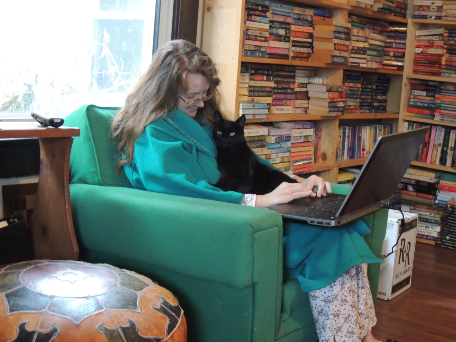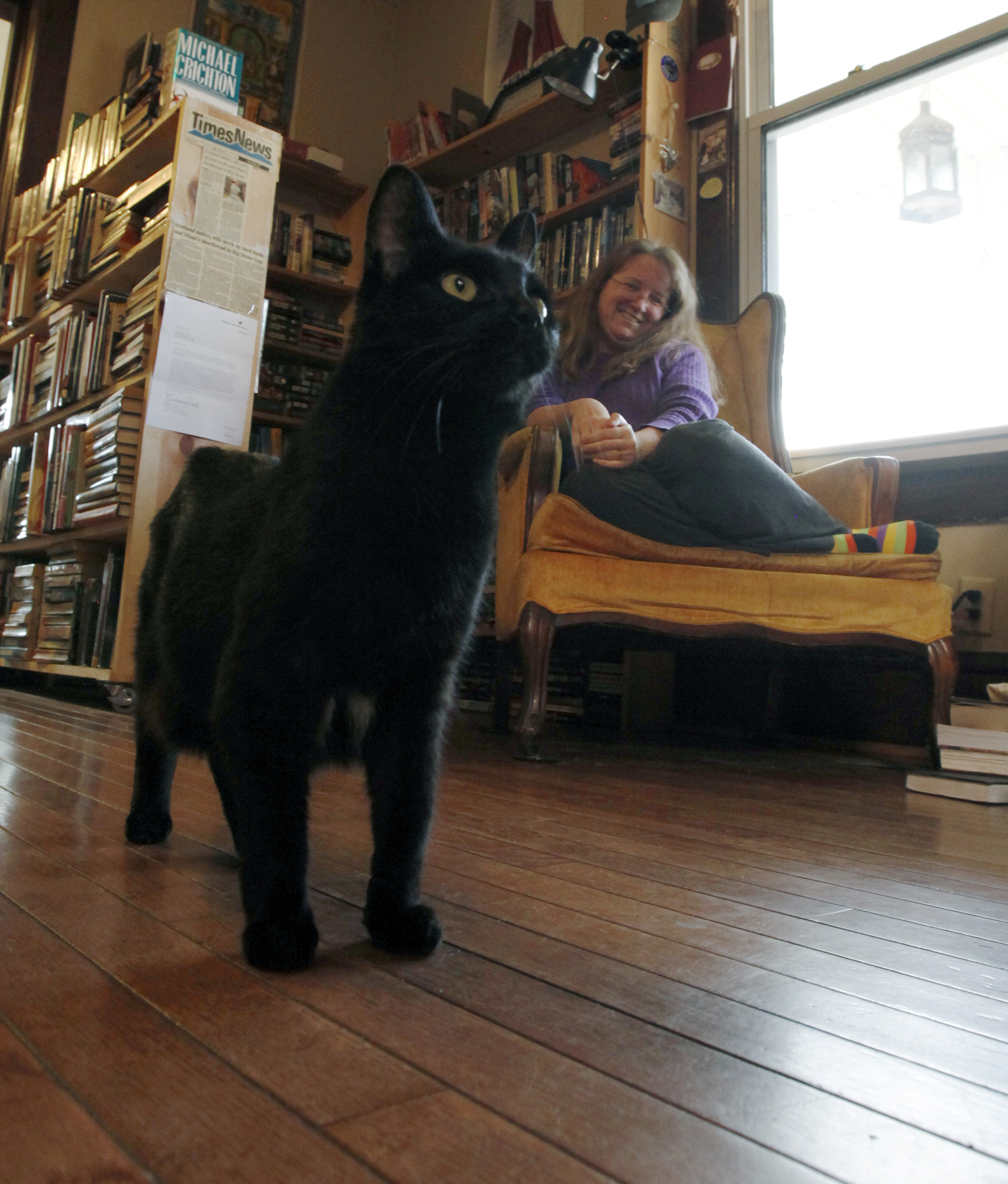 Valkyttie shifted house with us twice. Not content with emigrating from Scotland to England, she persuaded us that we needed to move to America, as she had heard the weather was warmer there. Her final move was to Big Stone Gap, where she oversaw the setting up of our bookstore – first inspecting the building of bookshelves, then supervising the displays of books. Thus established as the bookstore CEO, she quickly assigned ‘greeter’ duties to her arch-nemesis cat Beulah, and then recruited Owen Meany and Nike for more menial tasks.