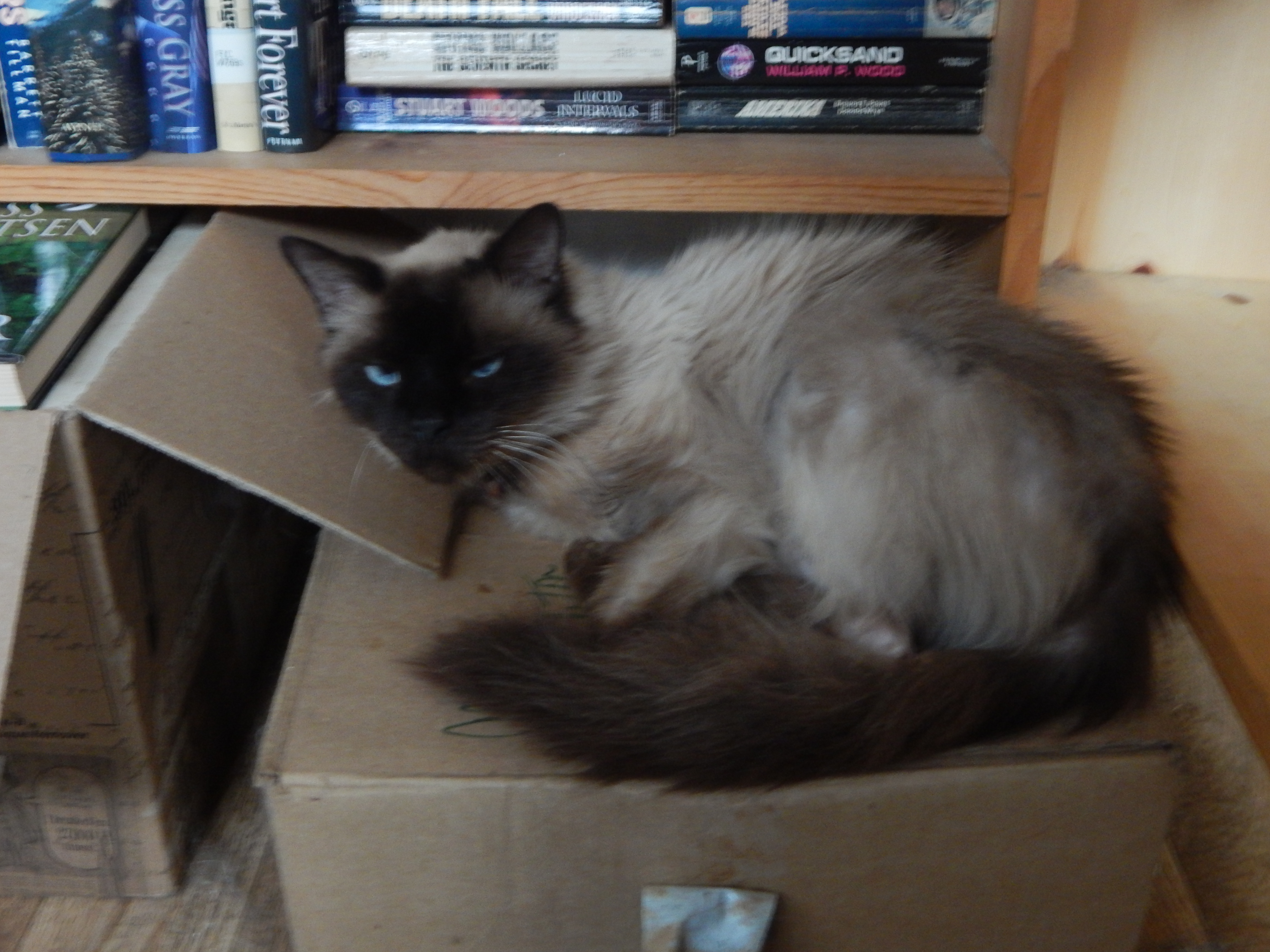 Laurel is our middle-aged foster cat. A beautiful Siamese with a touch of nervous eczema, she is no longer nervous, it seems. In fact she has gone from hiding in corners to dominating the entire bookstore.