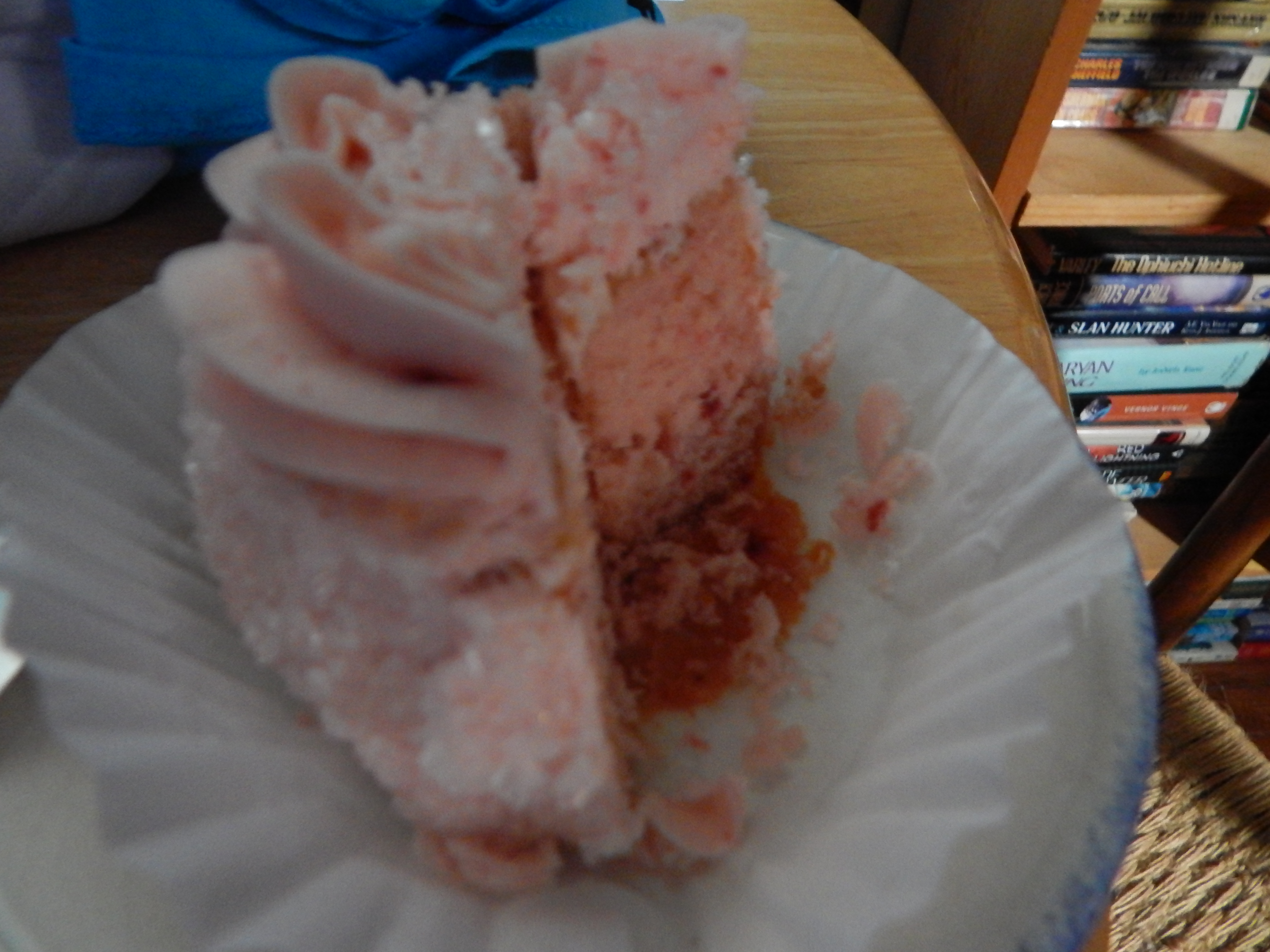 Yesterday I opened my microwave and a wee box from Blackbird Bakery sat there. Inside I discovered the Mother of all Pink Cupcakes – tall icing, silver sugar sprinkles, wee flowers, the kind of thing Our Hadley would have picked out if she’d been taken to the bakery, shown the cakes, and told she could have any one she wanted.