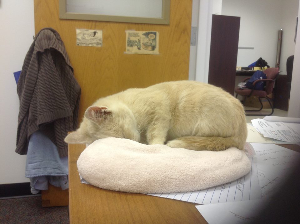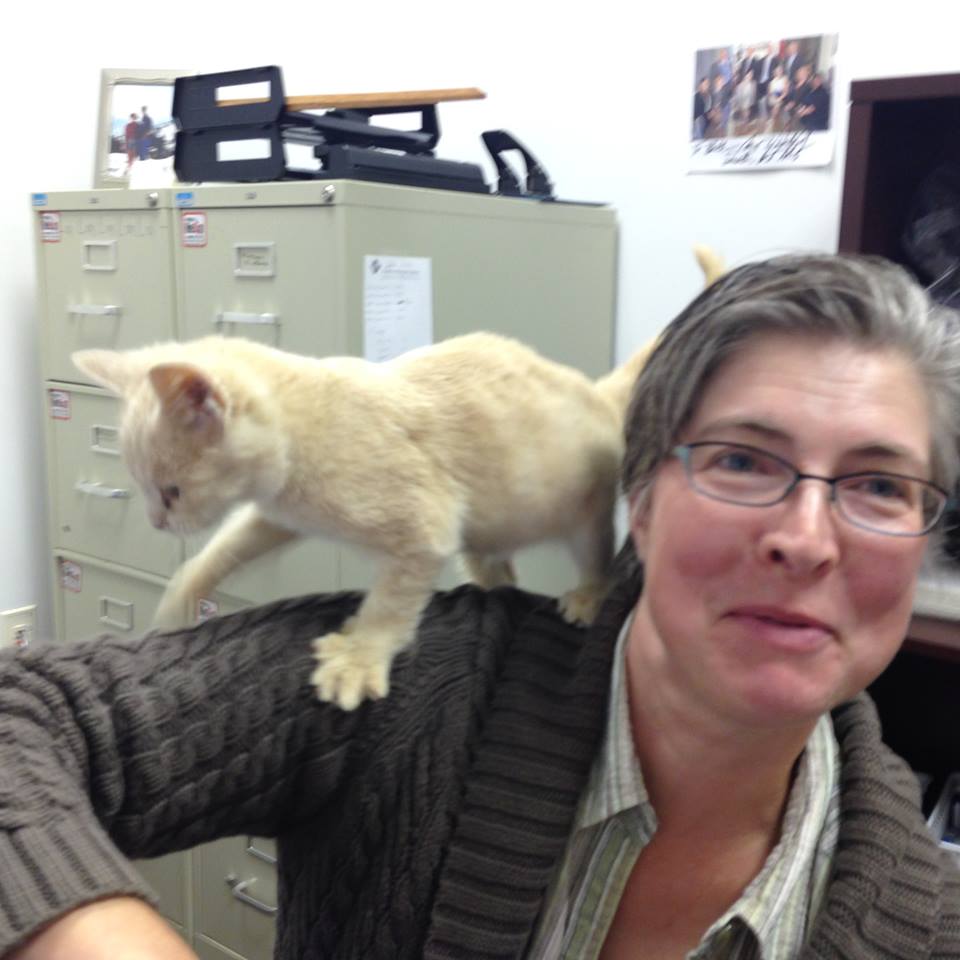beth with stephen pinkertonBeth sighed, bunched a sweater on her desk to make him a bed, and gave him a lanyard to play with. We began stuffing stuff into boxes. We may or may not have stopped now and then to play with the kitten.