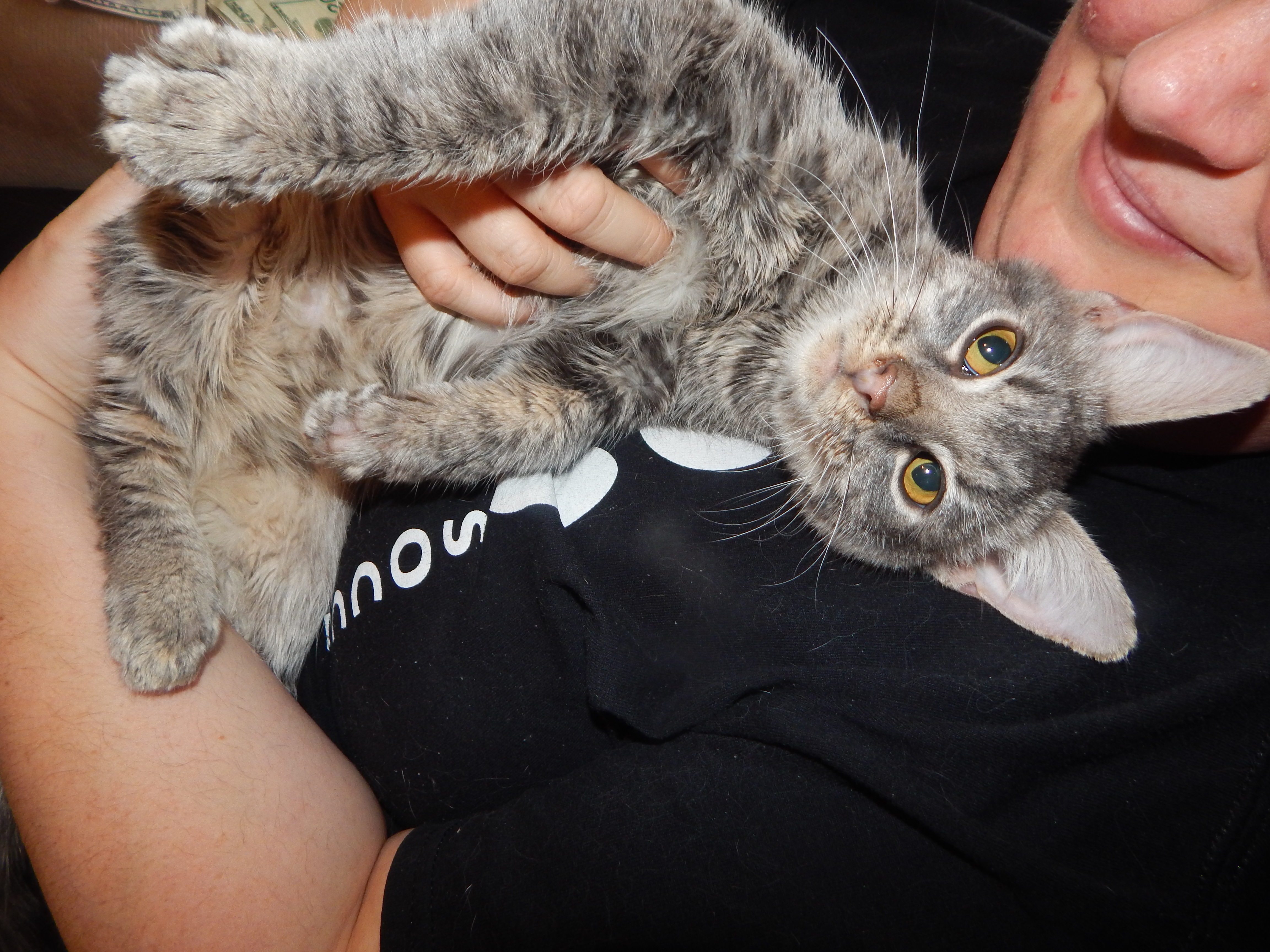 Oh yeah, I’m adoptable. I have fur that everybody says is really unusual and pretty – look at it one way and it’s stripes, but from the other way it’s spots. And it’s silver, changeable like mercury. So if you want to adopt me, I’m hanging out at the bookstore with some other cats who got a second chance. We’re none of us babies – I think Izzy is the youngest, and she’s five months old. Real brat, too, if you ask me – but we’re all great purrsonalities. So come visit the bookstore and while you’re there be sure we get in a cuddle, okay? ‘Cause I wanna say thanks.