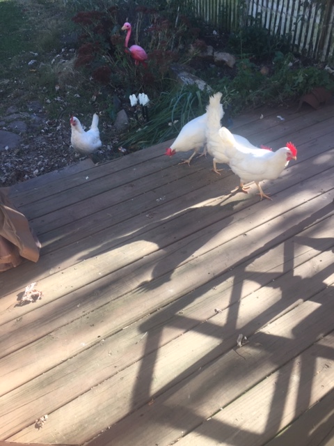 Then, more recently we received another two – retired government workers! They had been employed to track any evidence of West Nile Virus by having their blood tested regularly. After their stint is finished these chickens are re-homed to people who must promise not to eat them. They quickly settled in as well and within days had become good buddies with the original two. We christened one of the newbies ‘Elissa Hirple’ because she was limping when she came and the other one ‘Kathy’. But we didn’t see any eggs from them! (Also Ms. Hirple overcame her limp.)