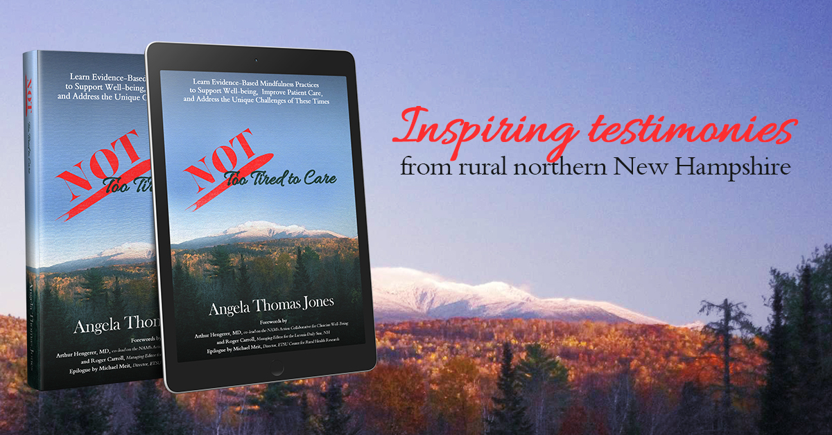 New Hampshire author Angela Thomas Jones of Bethlehem released a new book with Amazon Sunday November 29. Foreword written by Dr. Art Hengerer, MD co-lead of the National Academy of Medicine Action Collaborative for Clinician Well-being and Epilogue by Michael Meit, ETSU Center for Rural Health Research and his team from Kentucky. NOT Too Tired to Care chronicles how a grassroots movement in the northern rural region of NH based on data showing many health care workers are burned and NOT talking about it for fear of losing their job.  This book weaves research and data with real-life experience into a recipe that will boost your natural ability to move from survival mode to thriving and sustain the long haul. Studies suggest 20% compassion satisfaction in our total workload is necessary for maintaining resilience to keep burnout at bay.Learn how to deepen your capacity for compassion satisfaction by using a simple 4-step evidence-informed practice called HomeBase. Angela has led her colleagues to join the Action Collaborative on Clinician Well-Being and Resilience founded in 2017 by the National Academy of Medicine. As a licensed addiction professional with three decades of experience on the front lines specializing in trauma-sensitive mind-body practices, she is helping individuals, families, and organizations deepen their capacity for compassion satisfaction. Step by step instructions for how to join this national movement for Well-Being and Resilience are included. Hear what others are saying about NOT Too Tired to Care.
