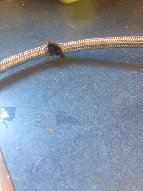 The metal braided hose had a hole and was spraying water happily – – –