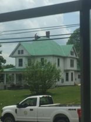 The first chimney had a flat section of roof around it, but the second one was coming out of a sloping roof. So they had to build a scaffolding work platform off the slope, which isn’t easy at all. But this morning the mason was up there and had started work on re-building that chimney. If the weather holds up tomorrow, I wouldn’t be surprised if they got it finished.