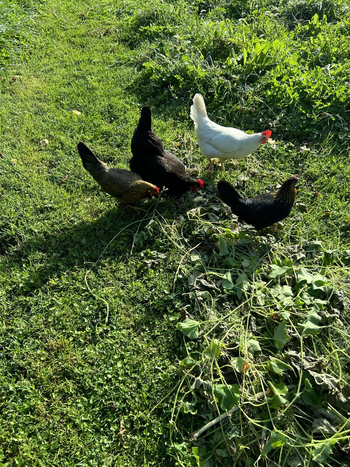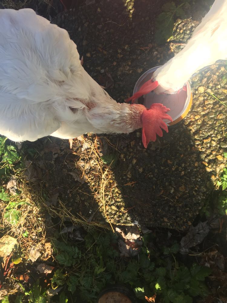 We currently have five chickens – two big whites, one ginormous black, and two banties, one brown and one black, both with golden necks.