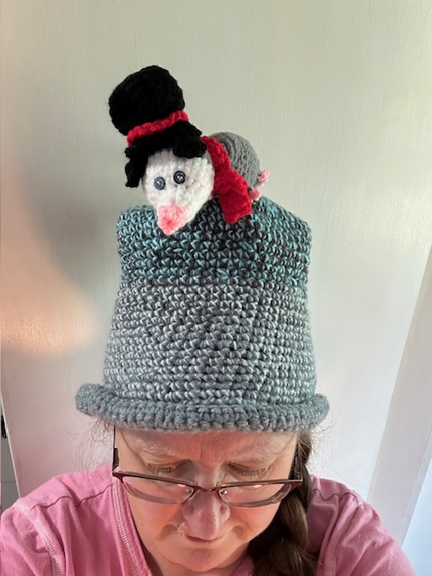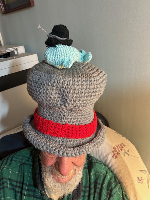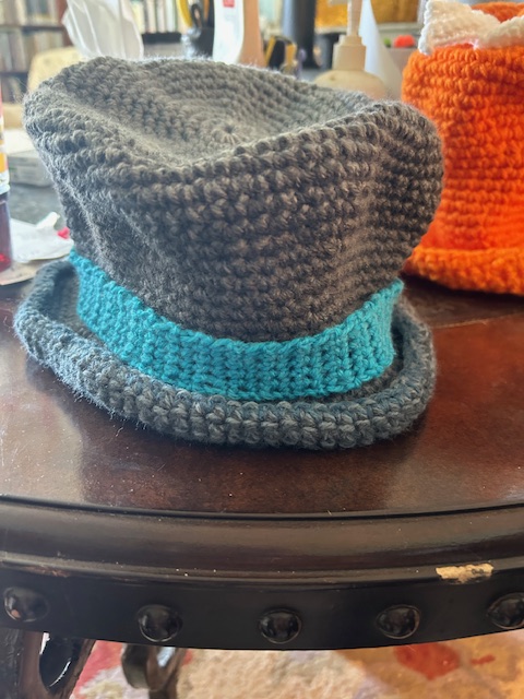 Hats are therapeutic! Comparatively instant gratification, for starters. I got through the pandemic lockdowns knitting hats for kits passed out by a Street Medicine organization in BigIndustrialCity. Now I make them for kids in the Navajo Nation as well. As much as I’d love to create world peace and justice for all, making hats is what I can do. I use oddments of “legacy” yarn, which adds a bit of ‘green’ to the enterprise and ensures that no two hats are the same, even after making hundreds of them. Turns out that even dimestore Santa Claus yarn can make a handsome hat spiraled with black. …do not know how a possum hat would go over, but…