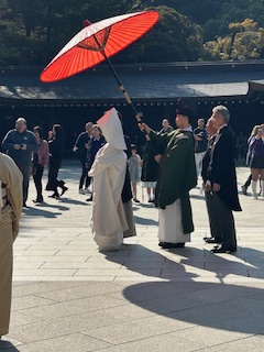 Which set is up for a tired but fulfilling day: we passed the gate to Edo Castle, saw the 2020 Tokyo Olympics torch, and arrived at the temple in time for the wedding we suspected was happening. We kept passing women in high heels and long skirts that just didn’t match the gravel path we were on, and at one point a photo that we figured was for an engagement was taking place. People were carefully moving around the couple, but she was in a white short dress.