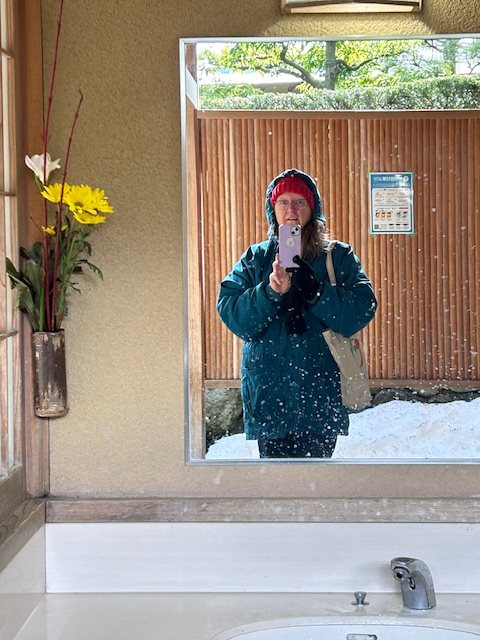 She had a small display of handmade jewelry all in the same pattern, a family crest. Her sister makes them. Amelia and I treated ourselves to earrings, and then headed for a neighborhood outdoor onsen. These communal baths use volcanic hot water with a lot of natural minerals in it, and they are awesome. International incident #18, I left my glasses in the washing room, so had to reenter it after the onsen, with my sweatshirt on. You don’t wear street clothes into the bathing area.