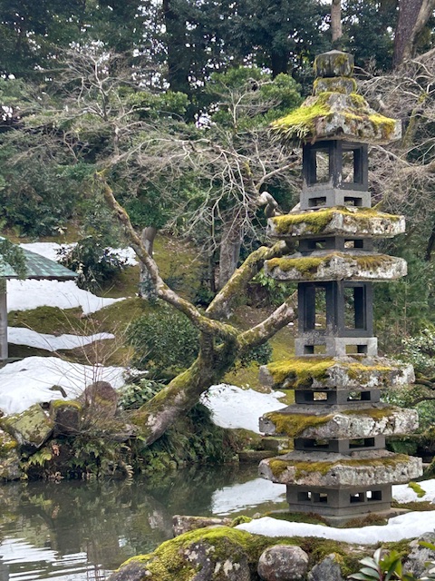 Kenrokuan Gardens are in Kanazawa, and they are quite something. I enjoyed them, but Amelia was having a mystical experience. After her first trip to Japan a couple of years ago, she built a Shinto garden at her Airbnb–which is her maternal grandmother’s old house, modernized for visitors–and we do believe she has the only Tori gate and Inari shrine in Elk Creek, Virginia. (Inari is the white fox who guards rice, and therefore prosperity and possibility.)