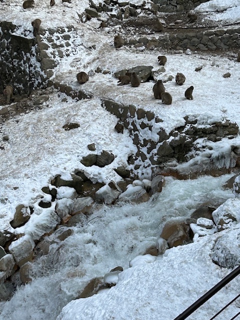 We saw monkeys. Big grandfather monkeys, teenage monkeys, baby monkeys, mama monkeys with babies on their backs. There were roughly three people for every monkey, and some of them had massive camera lenses. I got tired of taking photos of monkeys sitting under these lenses while people trained them on far off slopes. I laughed at one guy who was photographing a monkey sitting coquettishly on a stone in the hot steam of the spring, while next to him another monkey touched the pompom on his hat. Turning from this scene, I nearly tripped on a monkey crossing the bridge behind me.