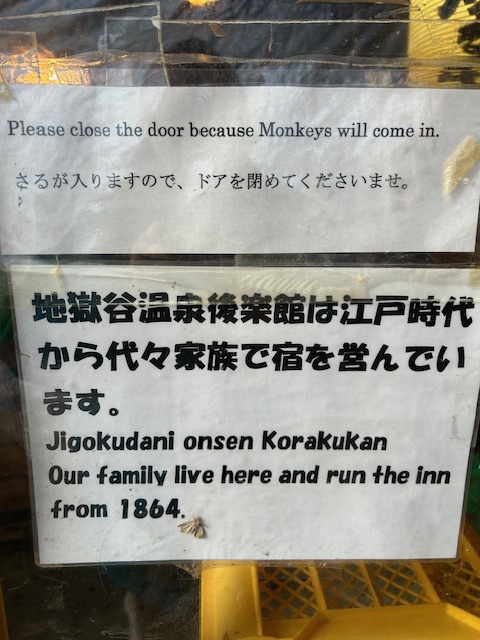 Amelia and I decided not to go to the human onsen there. Sharing human water is one thing, but with monkeys is another. We stopped at an inn where a kindly elderly man would make us hot cocoa for 500 yen. The sign said his family had been running the place for 9 generations.