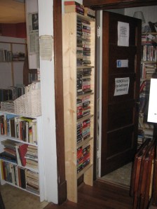 Give us an inch, and we’ll build a bookshelf. Those of you who have read the book or visited our shop can picture the place: is there a space left where we could put up another? (Regular readers may recall, from our November visit to Philly, the outrage Jack expressed at finding Walk a Crooked Mile Bookshop had indeed used their bathtub.)