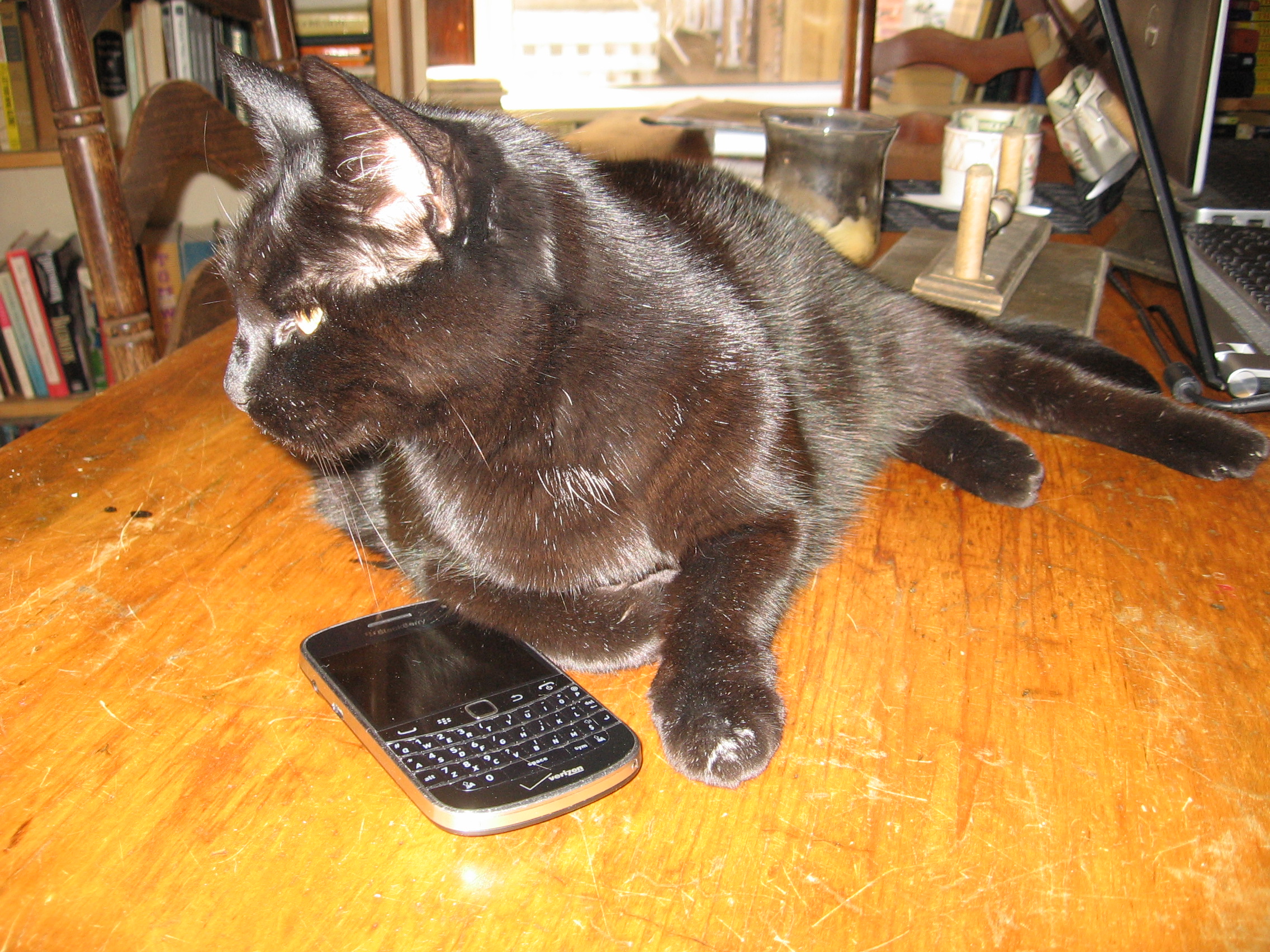 But the newest bookstore staff cat, Owen Meany, is just coming to grips with stardom. We didn’t have him while Wendy was writing; he came just at the end, and is named for the book Wendy was not supposed to hate. Owen is still too kittenish to carry off ‘aloof,’ and doesn’t have a personal domain to be proud of, or a story from the book for people to react to, so he does – – – kittenish things.