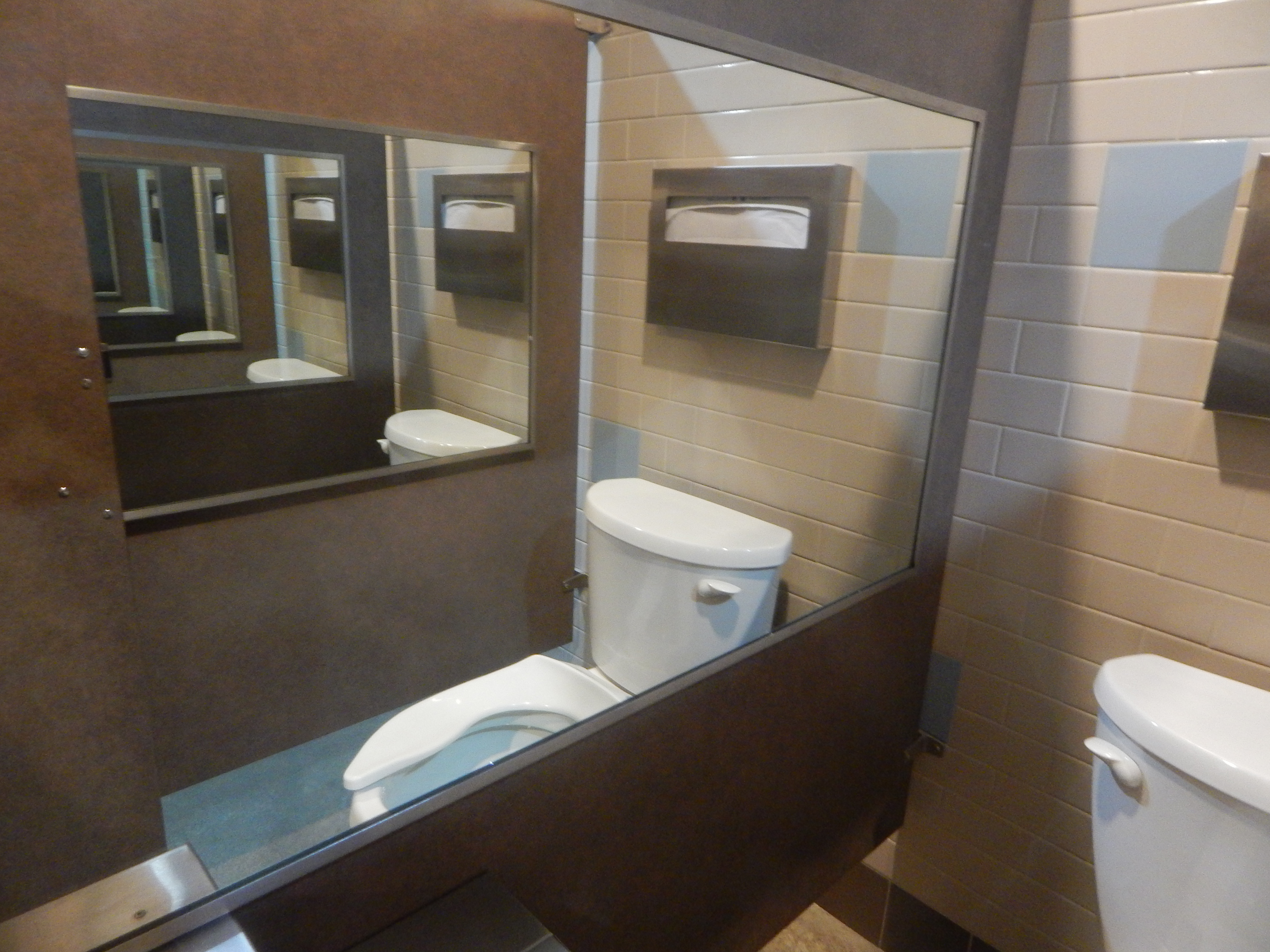 One of the stalls in the ladies’ bathroom was fitted with mirrors and a warning sign. It said this stall was set up so you could see what the camp bathrooms were like – the toilets and showers had no doors. Communal or not at all.