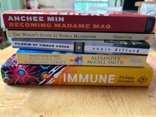 Five books are packed in my bag, and one is on my computer: Immune is the story of how our body’s defense systems work, and while it came out at the time of all-COVID all-the-time it’s about viruses and bacteria. I like the way the author writes (having started the book twice and gotten interrupted by life and other circumstances). He was describing sizes of a defense cell and an attacking virus once, and he said, “Picture an average height person staring at a bunny.” That makes it accessible.
