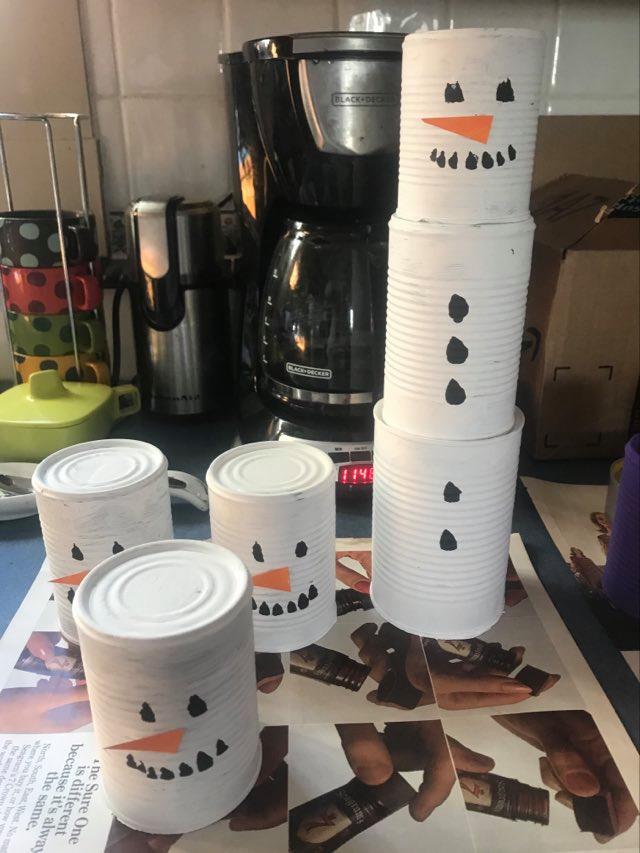 I began cruising Pinterest, which always makes Jack nervous. It’s not that he dislikes me picking up new hobbies; he doesn’t so much enjoy the part where “I just need you to poke the holes for me” and such. But he gamely welcomed my latest diversion: tin can snowmen.