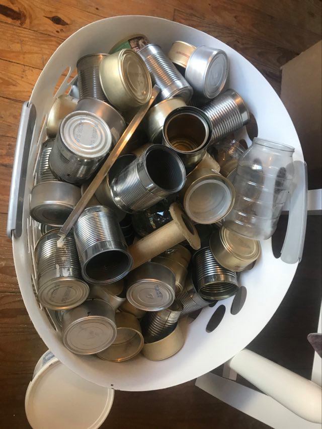 But the cans? They became planters for tomato seeds to give away, holders of cooking grease, even tart burners on coffee warmers. And still they piled up. We have a dog and four cats, after all.