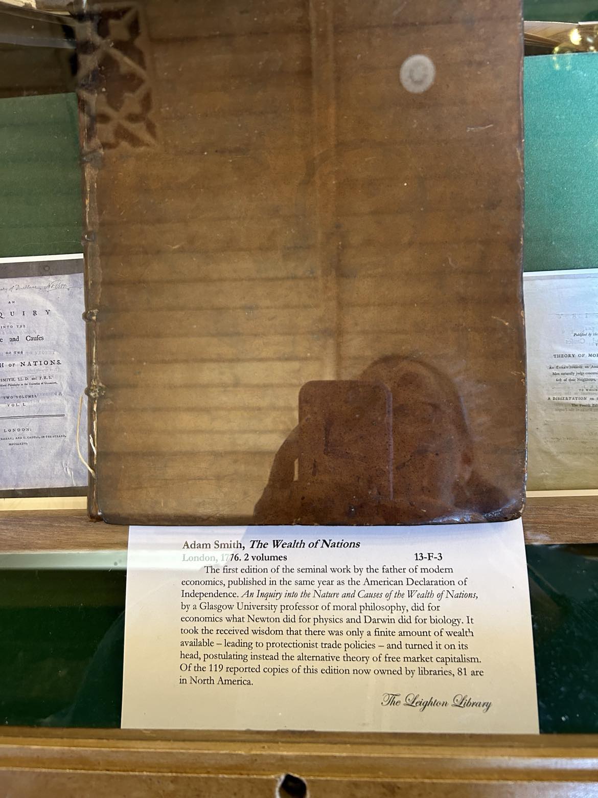 I spent a happy hour being allowed to touch first editions on vellum of the works of Burns, Locke, and other famous Scottish authors. Leighton library had belonged to a rich white guy who built it to deliberately let rich white guys borrow his books–for his own reasons. You can read about the library here, but there is nothing like someone interested in your tiny little museum to make your day as a museum guide. The authoritative scholar, the sweet volunteer, and I had a blast talking books and ideas and history that rainy afternoon in Dunblane.