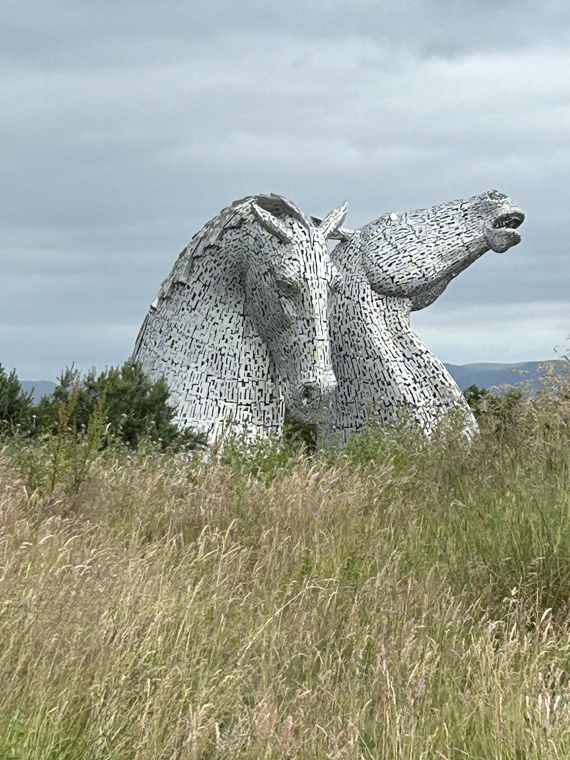Off we went to see the kelpies. These are horse head statues 98 feet high, made of thousands of little sheets of metal. They are gorgeous, and their models Baron (head up) and Duke were working Clydesdales. Kelpies, aka brumbies, aka water spirits/sprites/horses, are figures from folklore. Keplies are… unpleasant, yet functional. Water horses would come to you at the edge of some running water and be all sweet and “please feed me an apple you sweet young thing and please get on my back.” The second you did they dove down to the bottom and drowned you. Very useful for keeping kids away from deep water.