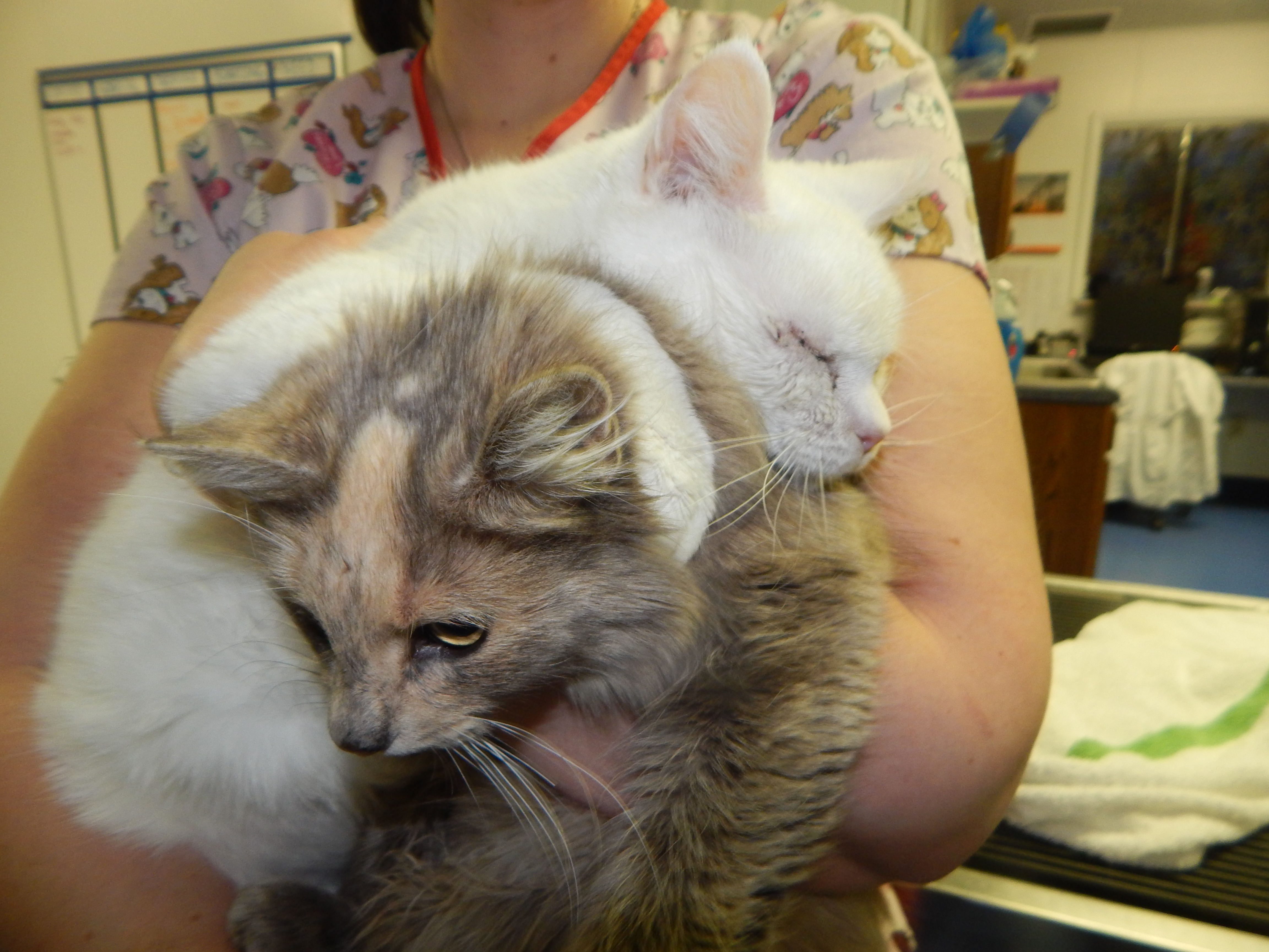 She grabs me – mid-stream, mind you – and I’m fighting for all I’m worth but the other chick appears from nowhere, and it’s back in the hard box with the see-through sides, and we’re moving again, and I think I’m going back to the barking dogs and scary smells place but after a LONG time (and I can hear other cats as we’re moving, but none of us know where we’re going) suddenly we’re in this bright room, and it’s again with the needle, but instead of it hurting the room starts spinning, and then it’s dark…
