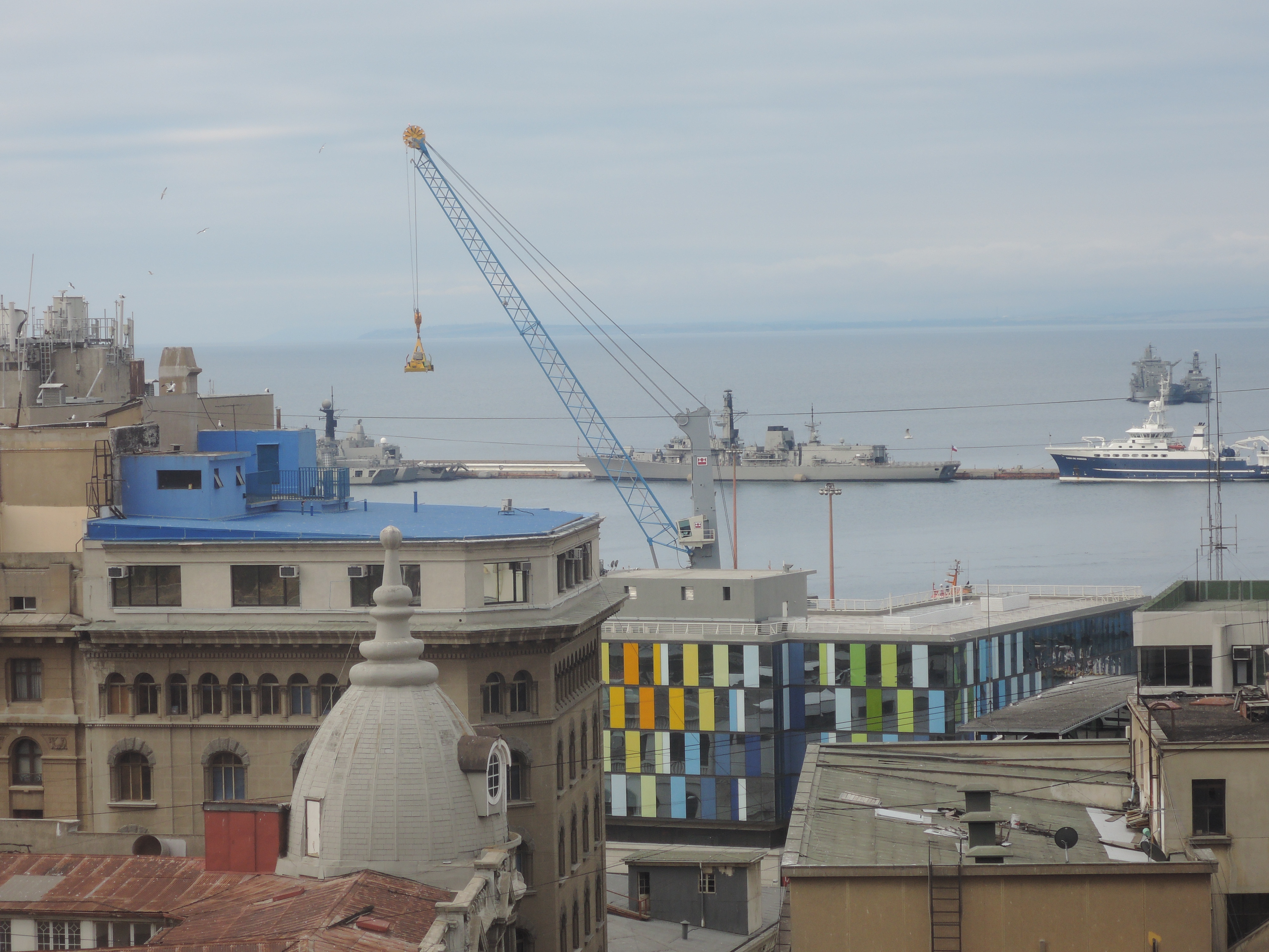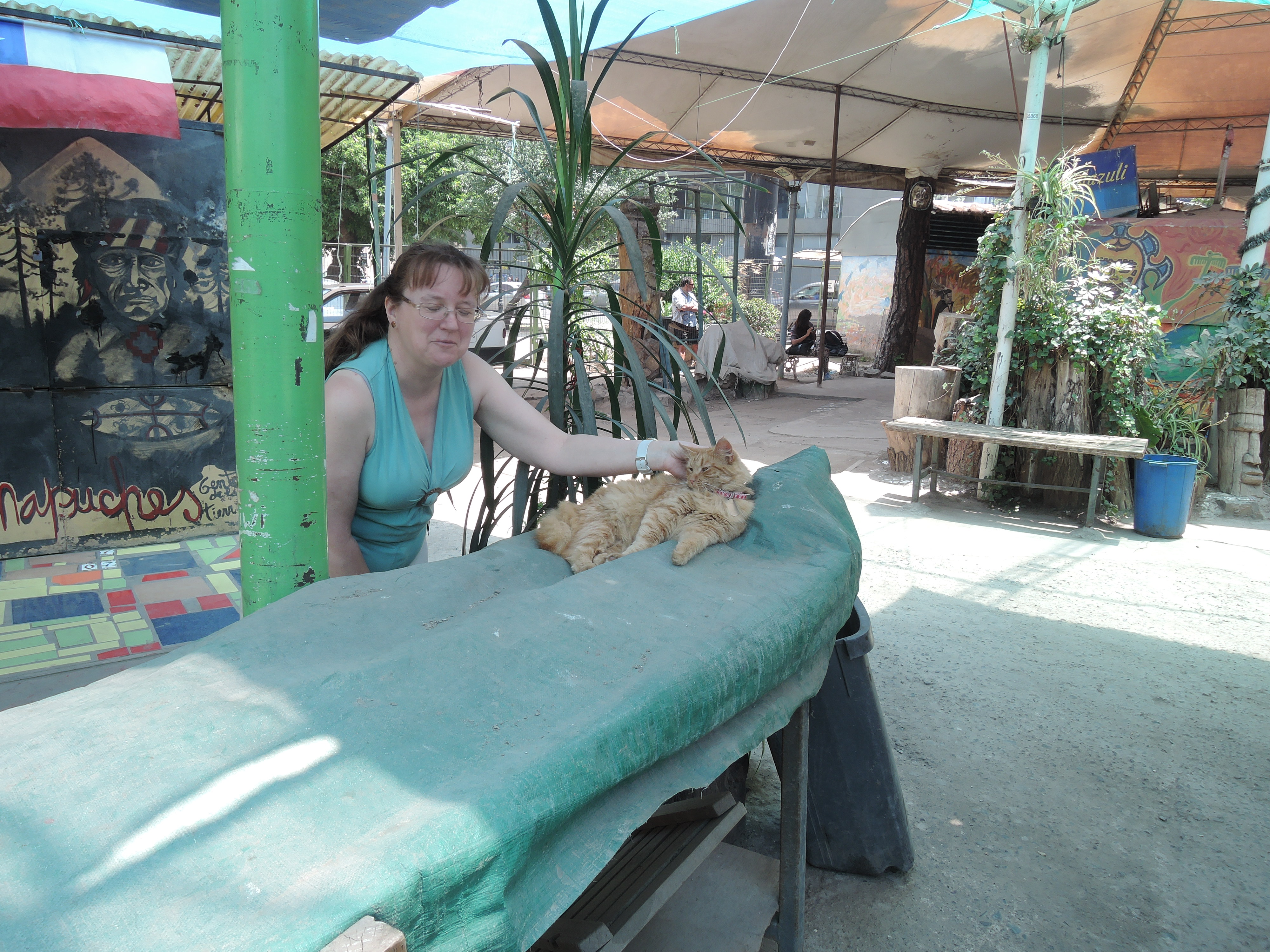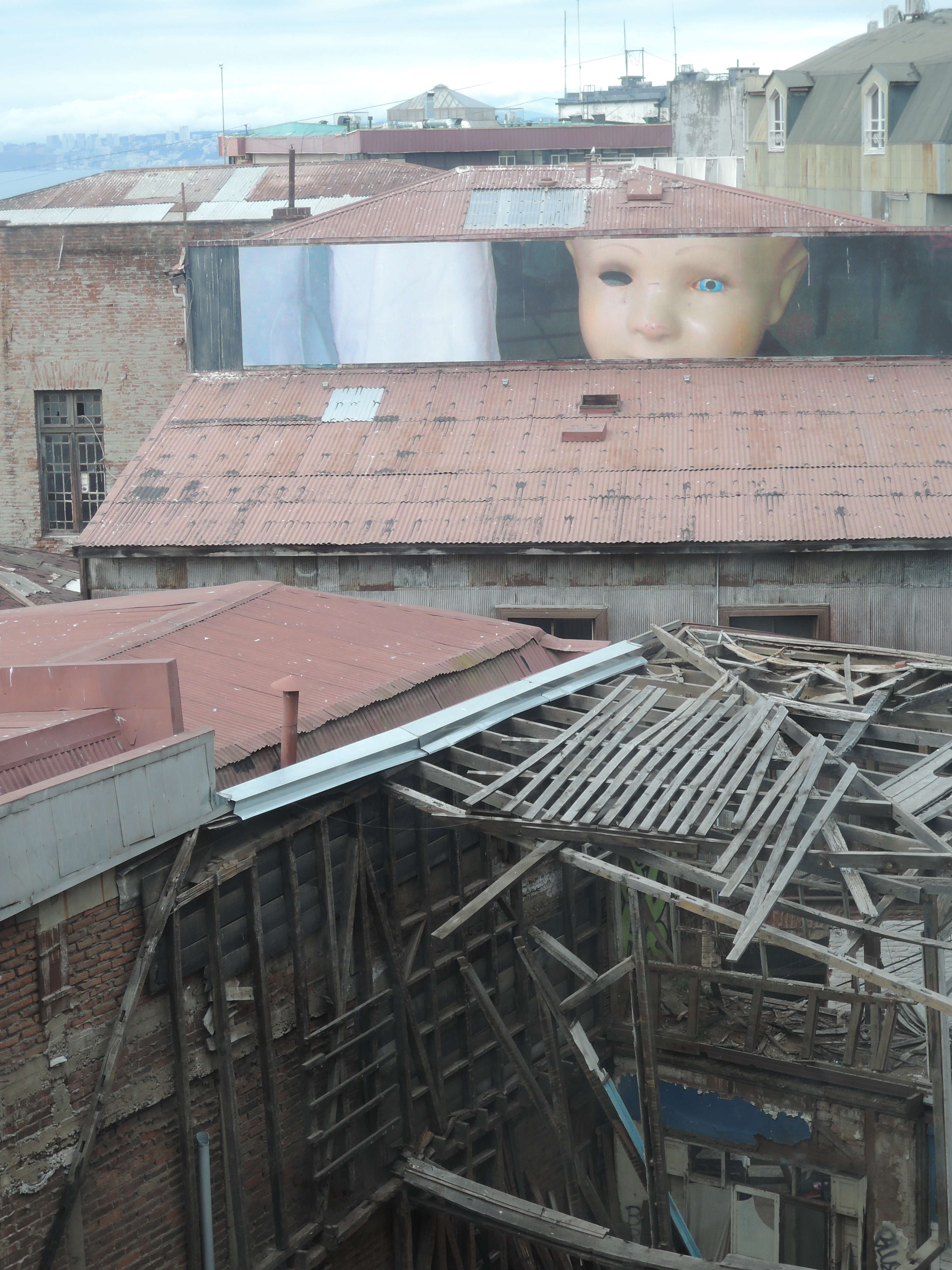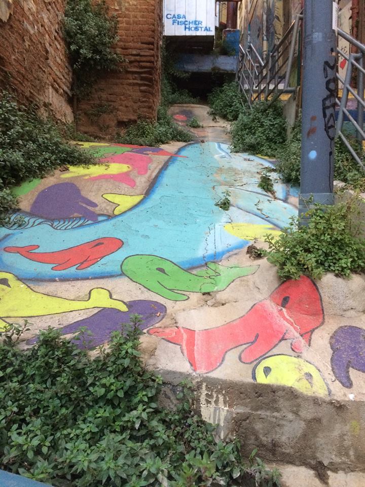 Specifically, to Valparaiso, where the walls are covered with murals and gang tags. It is illegal to write on walls in the city, but if a building owner wants his wall decorated, up and coming artists vie for the exposure. Some are instantly recognizable for their signature art elements (hummingbirds, dolls, patchworks, etc.). Others are trying to break into the bohemian art scene that thrives here, so they offer to paint for the cost of materials.